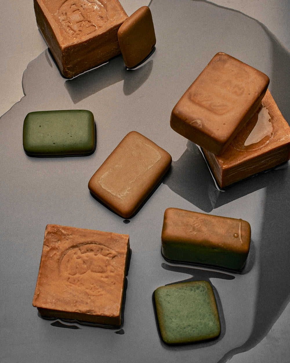 The hero ingredient is laurel oil which comes in at the end of the process. The mix is taken from the vat and poured over a large sheet of waxed paper on the floor of the factory. At this point, the soap is a large, green, flat mass, and it is allowed to cool down and harden.The soap is then cut into cubes and stamped and stacked in staggered cylindrical shapes to allow maximum air exposure and are then aged from six months to a year.